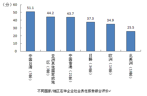 、中國(guó)香港、日韓、歐洲地區(qū)的企業(yè)社會(huì)責(zé)任報(bào)告得分分別為44.2分、43.7分、37.3分和34.9分,處于發(fā)展(二星級(jí))階段;北美洲地區(qū)企業(yè)發(fā)布報(bào)告得分最低,為25.5分,處于起步(一星級(jí))階段。