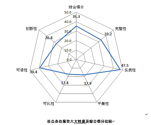 從完整性、實(shí)質(zhì)性、平衡性、可比性、可讀性、創(chuàng)新性等“六性”來(lái)看,中國(guó)企業(yè)社會(huì)責(zé)任報(bào)告的實(shí)質(zhì)性得分最高,為47.5分,處于二星(發(fā)展)水平,即報(bào)告在披露企業(yè)社會(huì)責(zé)任關(guān)鍵議題方面表現(xiàn)較好;可讀性得分其次,為39.4分,即報(bào)告綜合運(yùn)用了圖表等表現(xiàn)形式,利于讀者閱讀;報(bào)告完整性、創(chuàng)新性得分相對(duì)適中,分別為33.2分和26.8分,處于二星和一星水平。另外,報(bào)告平衡性與可比性較差,分別為17.9分和17.4分,處于一星(起步)水平,說(shuō)明多數(shù)企業(yè)沒(méi)有披露連續(xù)的關(guān)鍵績(jī)效指標(biāo),并定量說(shuō)明本企業(yè)社會(huì)責(zé)任履責(zé)水平在同行業(yè)中所處位次??傮w而言,中國(guó)企業(yè)社會(huì)責(zé)任報(bào)告的“六性”都還有較大的改進(jìn)空間。