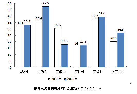 與去年相比,實(shí)質(zhì)性和平衡性表現(xiàn)較明顯,其他方面表現(xiàn)穩(wěn)定。其中,實(shí)質(zhì)性由去年的35.6分提高到47.5分,提高了11.9分,說(shuō)明企業(yè)越來(lái)越關(guān)注關(guān)鍵性議題的識(shí)別,注重與相關(guān)方進(jìn)行實(shí)質(zhì)性的交流和溝通;六大性質(zhì)中得分降低較為明顯的是平衡性,由去年的30.5分降低到17.9分,說(shuō)明很多企業(yè)在報(bào)告編寫過(guò)程中忽視負(fù)面信息的披露,存在“報(bào)喜不報(bào)憂”的現(xiàn)象。