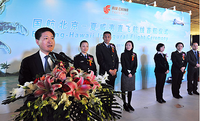 2014年1月20日15時(shí),中國(guó)國(guó)際航空股份有限公司(以下簡(jiǎn)稱“國(guó)航”)北京-夏威夷直飛航線首航儀式在首都機(jī)場(chǎng)3號(hào)航站樓舉行。美國(guó)駐中國(guó)大使館、首都機(jī)場(chǎng)海關(guān)、北京出入境邊防檢查總站、北京出入境檢驗(yàn)檢疫局、北京首都國(guó)際機(jī)場(chǎng)股份有限公司及中國(guó)國(guó)際航空股份有限公司的相關(guān)領(lǐng)導(dǎo)應(yīng)邀出席首航儀式。儀式現(xiàn)場(chǎng),來(lái)自夏威夷的舞者以熱情婀娜的草裙舞向來(lái)賓展示了夏威夷獨(dú)具特色的波利尼西亞文化,并為臺(tái)上嘉賓佩戴了絢麗芬芳的花環(huán),活動(dòng)現(xiàn)場(chǎng)洋溢著濃厚的熱帶風(fēng)情。