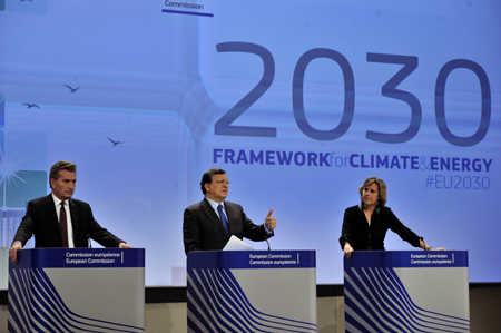 歐盟委員會22日公布2030年氣候和能源政策目標(biāo),規(guī)定歐盟成員國在2030年之前將溫室氣體排放量削減至比1990年水平減少40%,并保證新能源在歐盟能源結(jié)構(gòu)中至少占27%。 圖為歐盟委員會主席巴羅佐(中)、歐盟氣候行動專員康妮·赫德高(右)、歐盟能源專員岡瑟·歐廷格(左)當(dāng)日出席在布魯塞爾的新聞發(fā)布會。