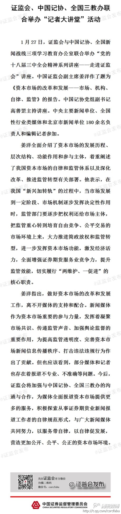 據(jù)證監(jiān)會(huì)微博消息,1月27日,證監(jiān)會(huì)、中國(guó)記協(xié)、全國(guó)三教辦聯(lián)合舉辦“記者大講堂”活動(dòng),證監(jiān)會(huì)副主席姜洋表示,證監(jiān)會(huì)將加強(qiáng)與中國(guó)記協(xié)、全國(guó)三教辦的溝通和合作,為媒體全面報(bào)道資本市場(chǎng)提供更多服務(wù),積極探索從事證券期貨業(yè)新聞報(bào)道工作者的自律規(guī)范形式,與廣大新聞媒體共同努力,以服務(wù)帶自律,以自律促發(fā)展,營(yíng)造更加公開(kāi)、公平、公正的資本市場(chǎng)環(huán)境。
