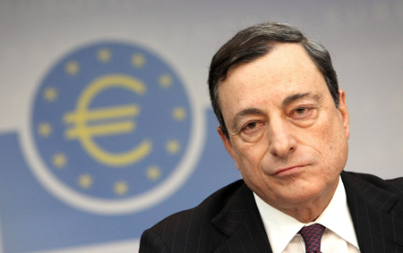 歐洲央行6日宣布,維持當前利率政策不變,主導利率依舊保持在0.25%之上。同時,英國央行(英格蘭銀行)宣布,維持當前貨幣政策不變,基準利率仍為0.50%水平,購債規(guī)模為3750億英鎊(約6130億美元)。 圖為歐洲央行行長德拉吉在當日舉行的發(fā)布會上表示,歐元區(qū)并未處于通縮當中,但歐洲央行會對物價持續(xù)走低保持警惕。