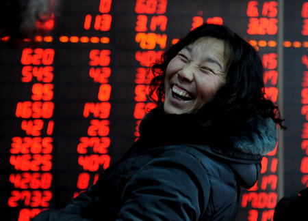 10日A股延續(xù)強勢上行,滬深股指漲幅雙雙超過2%。創(chuàng)業(yè)板指數(shù)在前一交易日基礎上繼續(xù)攀高,盤中創(chuàng)下1557.03點的歷史高點。馬年開局以來A股市場人氣迅速回升,帶動當日滬深兩市成交大幅放大至約2900億元,較前一交易日猛增近六成。當日所有行業(yè)板塊均隨大盤收漲。汽車板塊表現(xiàn)搶眼,實現(xiàn)逾4%的整體漲幅。 圖為當日在沈陽一家證券公司股票交易大廳,一名股民笑逐顏開。