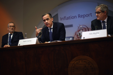 圖為英國央行行長馬克·卡尼(中)在報告發(fā)布會上發(fā)言。