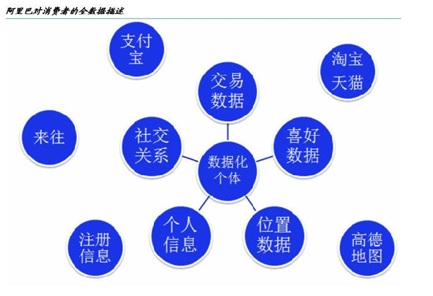 阿里巴巴圍繞消費者進行全流程的數(shù)據(jù)描述,支付寶:提供消費者的交易數(shù)據(jù)和信用;淘寶、天貓:提供消費者對于商品的喜好數(shù)據(jù);注冊信息:提供個人家庭地址、工作地址、手機號等個人信息;高德地圖:提供