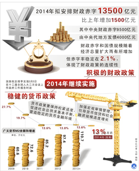 與2013年相比,收支差額的13500億元比2013年增加1500億元,而赤字率為2.1%左右,與2013年持平!2014年實施積極的財政政策,適當擴大財政赤字,保持一定的刺激力度,同時赤字率保持不變,體現(xiàn)宏觀政策的穩(wěn)定性和連續(xù)性,促進經(jīng)濟持續(xù)健康發(fā)展和財政平穩(wěn)運行!眻蟾娣Q。