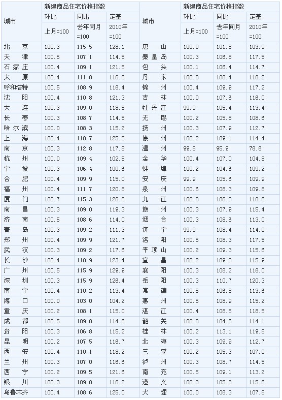 與去年同月相比,70個(gè)大中城市中,新建商品住宅(不含保障性住房)價(jià)格下降的城市僅有溫州1個(gè),上漲的城市有69個(gè)。2月份,同比價(jià)格變動(dòng)中,上海漲幅最高為18.7%,最低為下降4.1%。