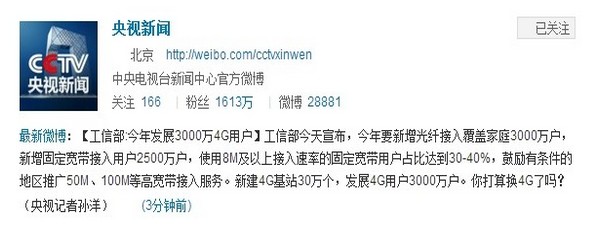 工信部:今年新建4G基站30萬個 發(fā)展4G用戶3000萬戶