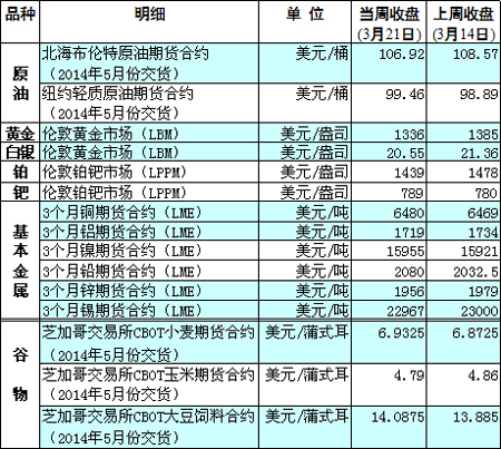 國際大宗商品期貨價(jià)格明細(xì)表[2014-3-24]