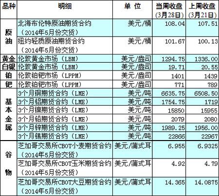 國(guó)際大宗商品期貨價(jià)格明細(xì)表[2014-3-31]