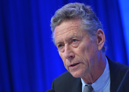 圖為IMF經(jīng)濟(jì)參事、研究部門主管奧利維耶·布蘭查德8日在IMF華盛頓總部的新聞發(fā)布會上發(fā)言。