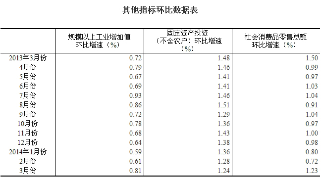 (2)根據(jù)季節(jié)調(diào)整模型自動修正結(jié)果,對近一年來各期國內(nèi)生產(chǎn)總值、規(guī)模以上工業(yè)增加值、固定資產(chǎn)投資(不含農(nóng)戶)、社會消費品零售總額環(huán)比增速進(jìn)行修訂。修訂結(jié)果及2014年一季度GDP環(huán)比數(shù)據(jù)、2014年3月份其他指標(biāo)環(huán)比數(shù)據(jù)如下:
