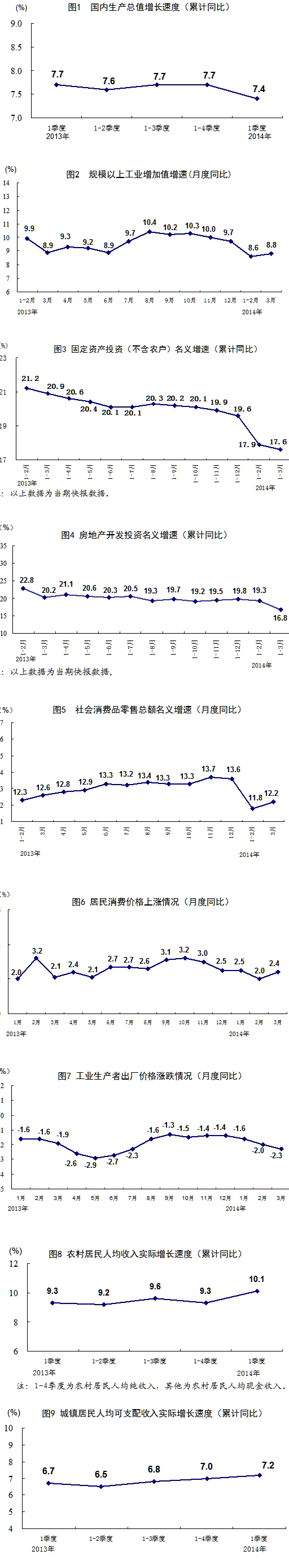 一季度,全國農(nóng)村居民人均現(xiàn)金收入3224元,同比名義增長12.3%,扣除價格因素實際增長10.1%。全國城鎮(zhèn)居民人均可支配收入8155元,同比名義增長9.8%,扣除價格因素實際增長7.2%。根據(jù)從2012年四季度起實施的城鄉(xiāng)一體化住戶調(diào)查,2014年一季度全國居民人均可支配收入5562元,同比名義增長11.1%,扣除價格因素實際增長8.6%。全國居民人均可支配收入中位數(shù)4694元,同比名義增長14.0%。一季度末,農(nóng)村外出務(wù)工勞動力16933萬人,同比增加288萬人,增長1.7%。外出務(wù)工勞動力月均收入2681元,增長10.1%。