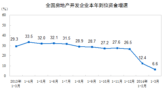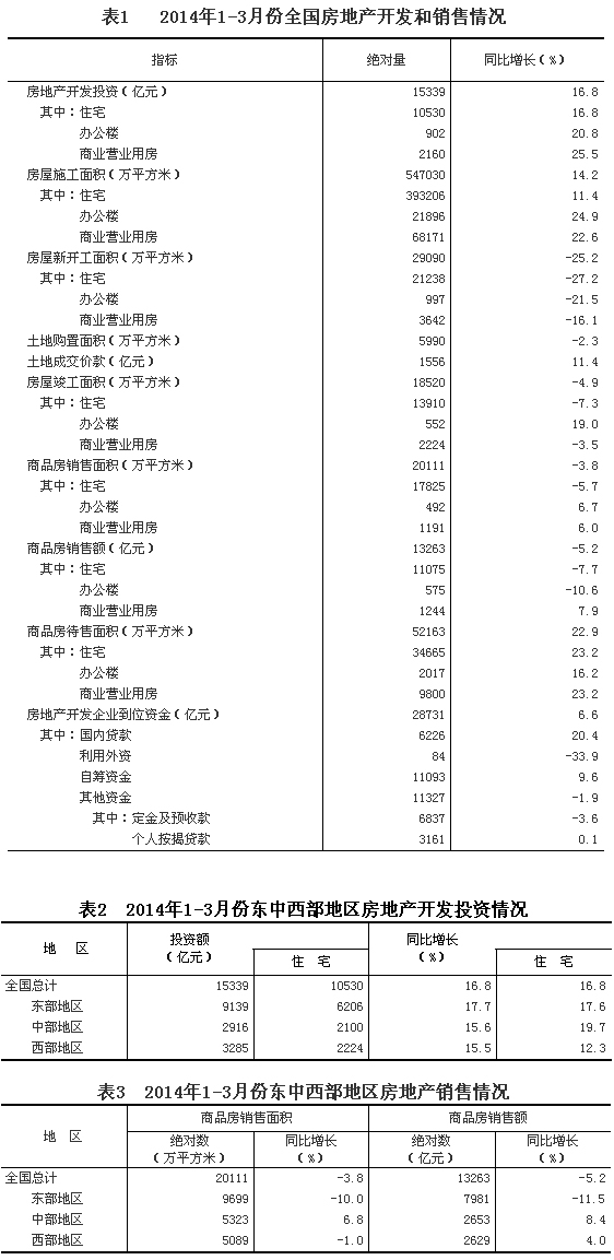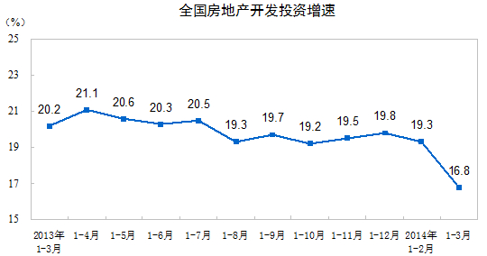 2014年1-3月份,全國(guó)房地產(chǎn)開發(fā)投資15339億元,同比名義增長(zhǎng)16.8%(扣除價(jià)格因素實(shí)際增長(zhǎng)15.5%),增速比1-2月份回落2.5個(gè)百分點(diǎn)。其中,住宅投資10530億元,增長(zhǎng)16.8%,增速回落1.6個(gè)百分點(diǎn),占房地產(chǎn)開發(fā)投資的比重為68.7%。
