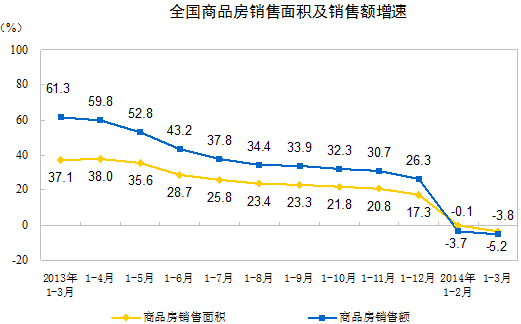 1-3月份,商品房銷售面積20111萬(wàn)平方米,同比下降3.8%;降幅比1-2月份擴(kuò)大3.7個(gè)百分點(diǎn);其中,住宅銷售面積下降5.7%,辦公樓銷售面積增長(zhǎng)6.7%,商業(yè)營(yíng)業(yè)用房銷售面積增長(zhǎng)6.0%。商品房銷售額13263億元,下降5.2%,降幅比1-2月份擴(kuò)大1.5個(gè)百分點(diǎn);其中,住宅銷售額下降7.7%,辦公樓銷售額下降10.6%,商業(yè)營(yíng)業(yè)用房銷售額增長(zhǎng)7.9%。