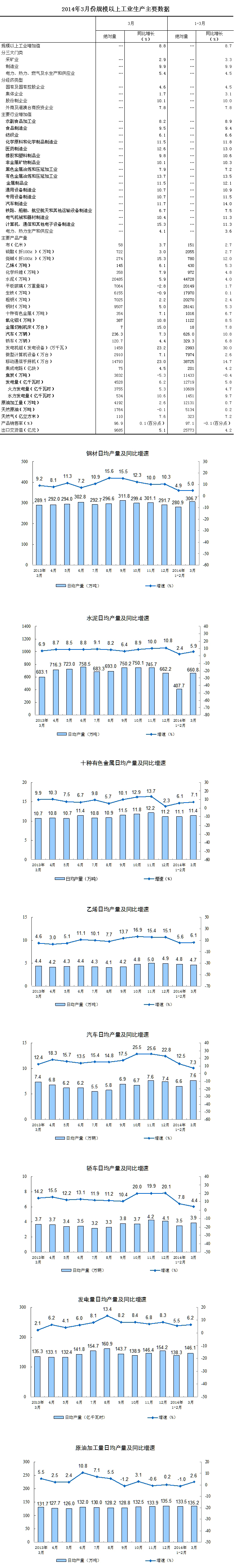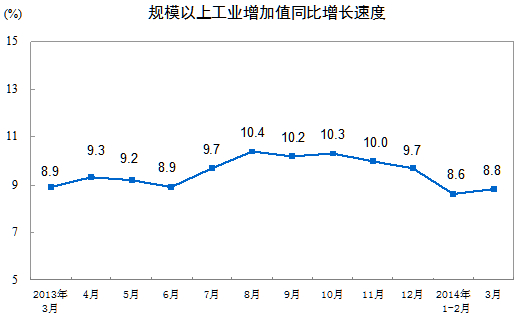 2014年3月份,規(guī)模以上工業(yè)增加值同比實(shí)際增長(zhǎng)8.8%(以下增加值增速均為扣除價(jià)格因素的實(shí)際增長(zhǎng)率),比1-2月份加快0.2個(gè)百分點(diǎn)。從環(huán)比看,3月份比上月增長(zhǎng)0.81%。一季度,規(guī)模以上工業(yè)增加值同比增長(zhǎng)8.7%。