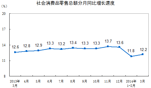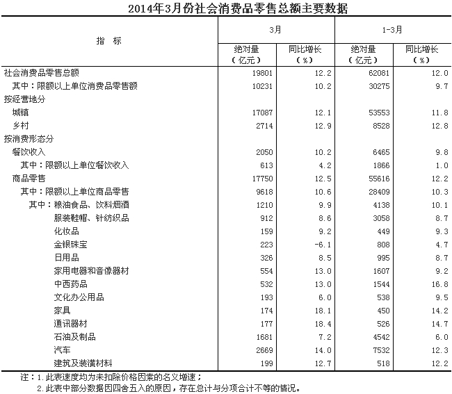 2014年3月份,社會消費品零售總額19801億元,同比名義增長12.2%(扣除價格因素實際增長10.8%,以下除特殊說明外均為名義增長)。其中,限額以上單位消費品零售額10231億元,增長10.2%。1-3月份,社會消費品零售總額62081億元,同比增長12.0%。其中,限額以上單位網(wǎng)上零售額[1]815億元,增長51.7%。
