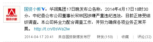 華潤(rùn)集團(tuán)17日晚發(fā)布公告稱,2014年4月17日18時(shí)30分,中紀(jì)委公布公司董事長(zhǎng)宋林因涉嫌嚴(yán)重違紀(jì)違法,目前正接受組織調(diào)查。本公司將全力配合調(diào)查工作,并努力確保各項(xiàng)業(yè)務(wù)正常開展。