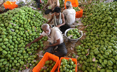 圖為印度果農(nóng)29日在印度海得拉巴一家水果市場(chǎng)上分揀芒果。
