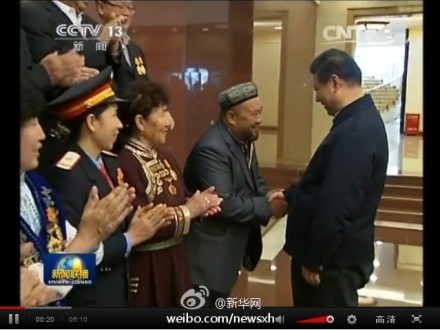 4月30日上午10時許,習近平和中共中央政治局常委、全國政協(xié)主席俞正聲,在中共中央政治局委員、新疆維吾爾自治區(qū)黨委書記張春賢和自治區(qū)政府主席努爾·白克力陪同下,來到新疆迎賓館10號樓會見廳,接見新疆28名勞動模范和先進工作者、先進人物代表,同他們親切握手、合影留念,之后同他們進行了座談。
