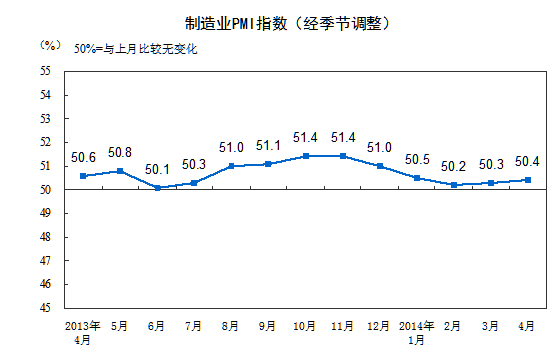 2014年4月,中國(guó)制造業(yè)采購(gòu)經(jīng)理指數(shù)(PMI)為50.4%,連續(xù)2個(gè)月微升0.1個(gè)百分點(diǎn),預(yù)示我國(guó)制造業(yè)繼續(xù)保持平穩(wěn)增長(zhǎng)勢(shì)頭。
