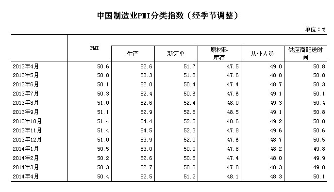 2014年4月,構(gòu)成制造業(yè)PMI的5個(gè)分類(lèi)指數(shù)3升1平1降。