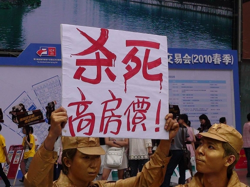 圖為2010年5月初舉行的成都房交會上,有市民裝扮得像銅人,高舉“殺死高房價”的牌子在會場內(nèi)游走。而相比2010年時的房價,至今全國房價平均漲20%以上。
