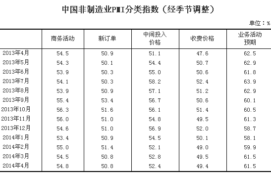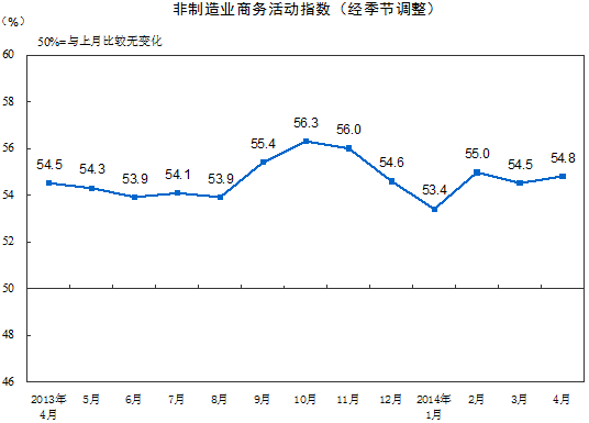 2014年4月,中國非制造業(yè)商務(wù)活動指數(shù)為54.8%,比上月上升0.3個百分點,高于榮枯線4.8個百分點。