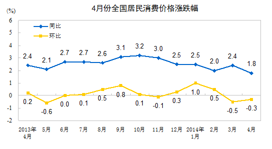 摘要:2014年4月份,全國居民消費(fèi)價格總水平同比上漲1.8%,不及預(yù)期。統(tǒng)計局解讀指出,去年4月份受“倒春寒”天氣影響,鮮菜價格大幅上漲,而今年4月份全國平均氣溫較常年同期高1.1℃,鮮菜價格大幅下跌,兩相比較導(dǎo)致鮮菜價格同比下降7.9%,影響CPI同比下降0.28個百分點(diǎn)。另一方面,受供大于求的影響,豬肉價格連續(xù)4個月同比下降。