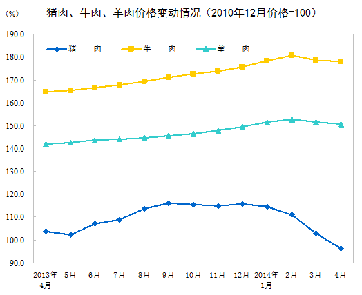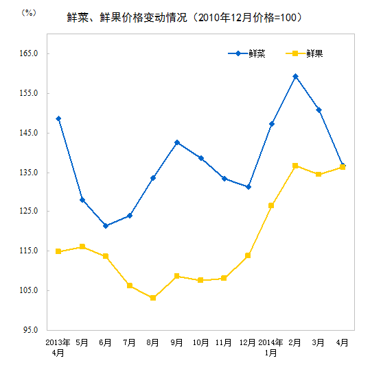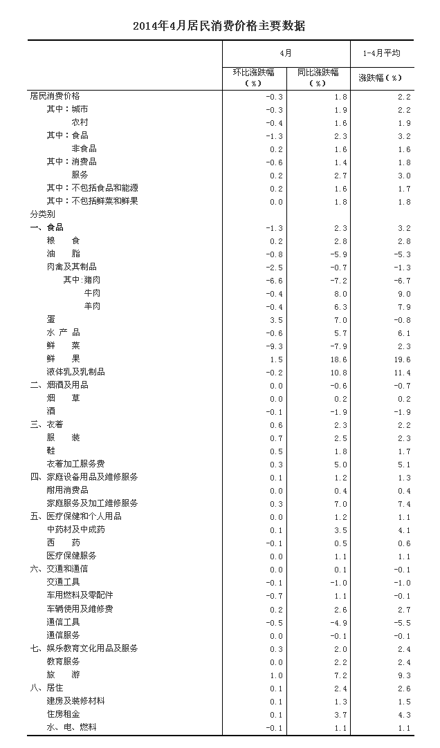 2014年4月份,全國居民消費(fèi)價格總水平同比上漲1.8%。其中,城市上漲1.9%,農(nóng)村上漲1.6%;食品價格上漲2.3%,非食品價格上漲1.6%;消費(fèi)品價格上漲1.4%,服務(wù)價格上漲2.7%。1-4月平均,全國居民消費(fèi)價格總水平比去年同期上漲2.2%。
