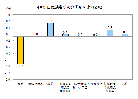 4月份,全國居民消費(fèi)價格總水平環(huán)比下降0.3%。其中,城市下降0.3%,農(nóng)村下降0.4%;食品價格下降1.3%,非食品價格上漲0.2%;消費(fèi)品價格下降0.6%,服務(wù)價格上漲0.2%。