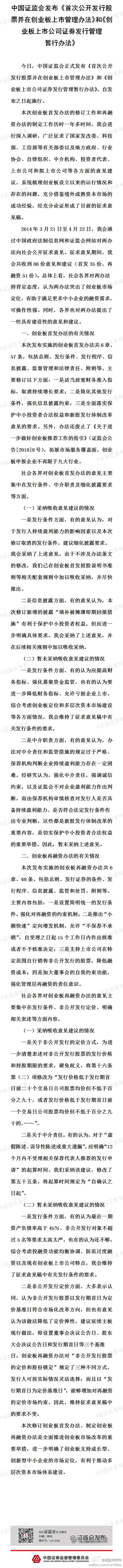 中國(guó)證監(jiān)會(huì)新聞發(fā)言人張曉軍今天介紹,創(chuàng)業(yè)板首發(fā)辦法的修訂和再融資辦法制定工作已經(jīng)結(jié)束,今天正式對(duì)外發(fā)布,兩個(gè)辦法自發(fā)布之日起實(shí)施。創(chuàng)業(yè)板再融資辦法中設(shè)置簡(jiǎn)明統(tǒng)一發(fā)行條件,推出小額定向發(fā)行機(jī)制,支持上市公司特定范圍自行銷(xiāo)售非公開(kāi)發(fā)行股份,強(qiáng)化再融資責(zé)任意識(shí)。