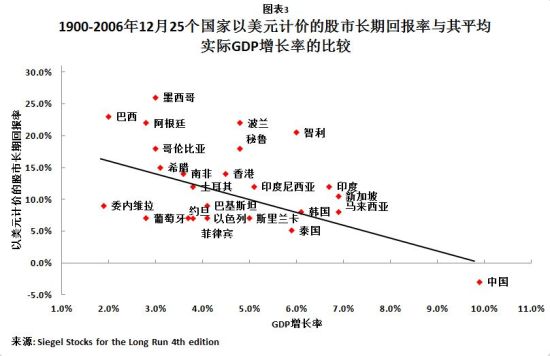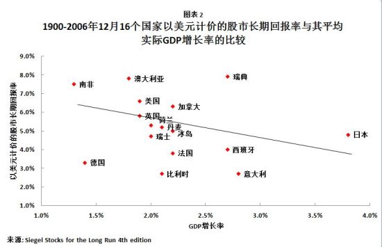 西格爾在其著作《股市長線法寶》中表示:“實際GDP增長率和股市回報率之間存在著一種反比關(guān)系。意即經(jīng)濟增長越快的個別(發(fā)達)國家,其股票投資者的股市回報率越低。同樣,在發(fā)展中經(jīng)濟體中單個國家的GDP增長率和股市回報率之間也存在著一種反比關(guān)系!