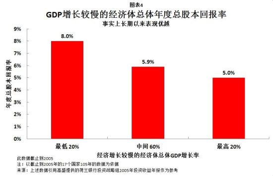 高盛私人財富管理部在仔細研究了這些數(shù)據(jù)后,就人均GDP增長和股價上漲之間的反比關(guān)系甚至跟不同經(jīng)濟體的增長率排名息息相關(guān)指出:“如果一個人在這一百年期間把資金投資在經(jīng)濟增長最慢的五個國家,其股市收益會比把資金投資在經(jīng)濟增長最快的五個國家平均每年高三個百分點……據(jù)我們自己對新興經(jīng)濟體1991年以來的分析顯示,新興經(jīng)濟體內(nèi)經(jīng)濟增長最慢的國家其股市收益比經(jīng)濟增長最快的國家要平均每年高五個百分點!眻D表4所示的是高盛對此關(guān)系的研究數(shù)據(jù)。