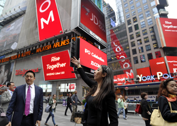 5月22日,行人在紐約曼哈頓經(jīng)過發(fā)布京東上市信息的納斯達克交易所門前街道。當天,京東集團正式在美國納斯達克上市。 記者