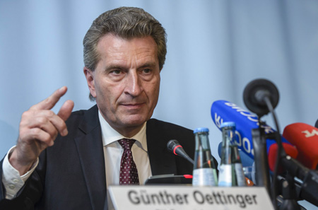 歐盟、俄羅斯和烏克蘭代表當(dāng)?shù)貢r(shí)間26日在德國(guó)首都柏林舉行新一輪天然氣問題談判。歐盟委員會(huì)負(fù)責(zé)能源事務(wù)的委員奧廷格(上圖)在之后舉行的記者會(huì)上表示,烏克蘭初步同意償還所欠俄羅斯天然氣款20億美元,并于6月7日再償還5億美元欠款。但俄烏雙方代表仍需和各自領(lǐng)導(dǎo)層及能源公司協(xié)商,28日晚將作出最終決定。