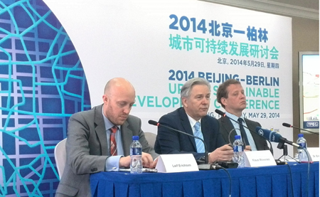 德國(guó)柏林市長(zhǎng)克勞斯·沃維萊特(中)29日在“2014北京-柏林 城市可持續(xù)發(fā)展研討會(huì)”上表示,歡迎更多中國(guó)企業(yè)到柏林投資。帶領(lǐng)柏林企業(yè)和高級(jí)經(jīng)濟(jì)代表團(tuán)來(lái)華訪問(wèn)的沃維萊特說(shuō),此次訪華將在經(jīng)濟(jì)和文化層面,展現(xiàn)出柏林作為向世界開放的歐洲中心大都會(huì)的城市形象。德國(guó)工商大會(huì)、柏林工商大會(huì)主席艾瑞克·施威澤表示,此次訪華將加強(qiáng)雙邊經(jīng)貿(mào)活動(dòng),在中德企業(yè)決策者之間搭建互識(shí)和互信的橋梁。據(jù)悉,代表團(tuán)包括17家德國(guó)企業(yè),主要涉及交通、物流、能源和環(huán)境領(lǐng)域。