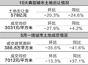 摘要:5月份一線城市土地成交建筑面積創(chuàng)近兩年來新低,二線典型城市土地成交同比也是量價齊跌。預(yù)計今年上半年,10大典型城市土地出讓金收入同比仍將保持大幅增長。