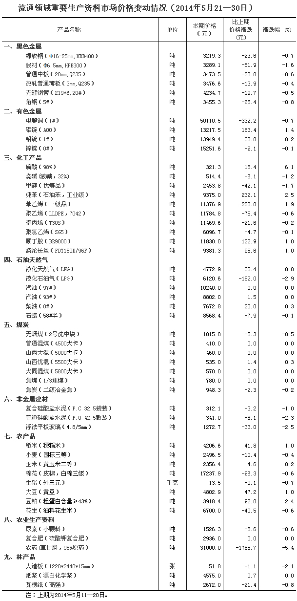 2014年5月下旬(2014年5月21-30日),據(jù)對24個。▍^(qū)、市)流通領域9大類50種重要生產資料市場價格的監(jiān)測顯示,與5月中旬相比,13種產品價格上漲,29種下降,8種持平。