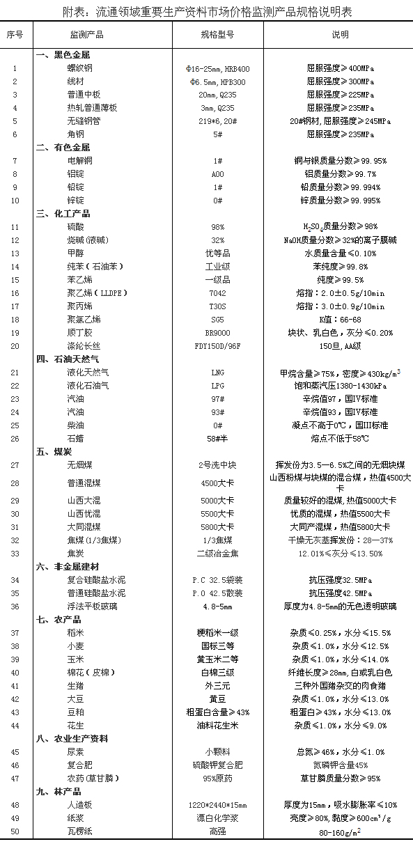 流通領域重要生產資料市場價格監(jiān)測內容包括9大類50種產品的價格。類別與產品規(guī)格說明詳見附表。