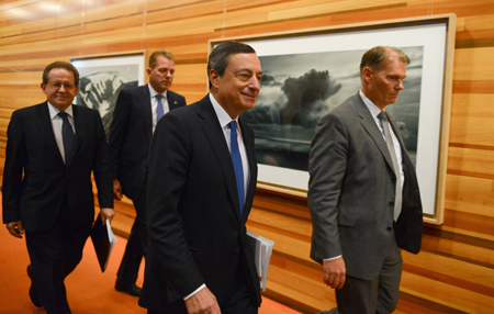 歐洲央行5日的貨幣政策會議決定,下調(diào)三大政策利率:將歐元區(qū)基準(zhǔn)利率下調(diào)10個基點至0.15%,隔夜存款利率由零下調(diào)至-0.1%,隔夜貸款利率下調(diào)35個基點至0.4%。歐洲央行行長德拉吉隨后還明確表示,將再次啟動定向長期再融資操作,并為啟動歐版QE做準(zhǔn)備。這一消息推動歐洲股市全線走強,歐元對美元匯率迅速下跌。德國DAX指數(shù)盤中首次突破1萬點。 圖為德拉吉(前左)前往會后的新聞發(fā)布會。