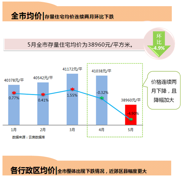 近日,北京云房數(shù)據(jù)市場(chǎng)研究部發(fā)布5月全市存量房住宅價(jià)格更新結(jié)果,數(shù)據(jù)顯示,5月北京市存量住宅平均價(jià)格為38960元/平方米,環(huán)比上月下跌4.9%。當(dāng)月二手房住宅市場(chǎng),由于新增房源、掛牌價(jià)降幅、議價(jià)空間等多項(xiàng)指標(biāo)均為年內(nèi)較高水平,使得北京二手住宅市場(chǎng)逐步由賣方市場(chǎng)變?yōu)橘I方市場(chǎng)。另一方面,由于受到自住房及信貸政策的影響,購房者觀望情緒嚴(yán)重,入市不積極,使得剛需購房的主要區(qū)域(即近郊區(qū))的成交量受到明顯影響。