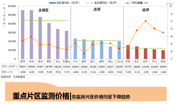 本月北京市各行政區(qū)價(jià)格均出現(xiàn)下跌情況,大部分區(qū)縣下跌幅度維持在5%左右,其中近郊區(qū)縣下跌幅度更加明顯,昌平下跌幅度最大,達(dá)到6.23%。此外,相較于主城區(qū)和近郊區(qū)縣,遠(yuǎn)郊區(qū)縣的下降幅度相對(duì)較小。