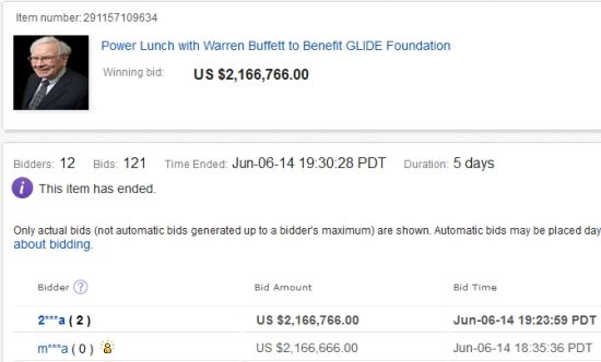 北京時間6月7日上午消息,北京時間6月7日上午10點半,經(jīng)過12位出價人121次激烈角逐,2014年巴菲特慈善午餐價落槌在216.6766萬美元(人民幣1353萬元),超越去年的“低價”紀錄。
