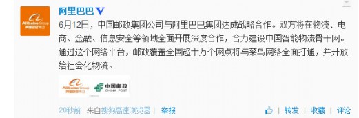 6月12日,中國郵政集團(tuán)公司與阿里巴巴集團(tuán)達(dá)成戰(zhàn)略合作。雙方將在物流、電商、金融、信息安全等領(lǐng)域全面開展深度合作,合力建設(shè)中國智能物流骨干網(wǎng)。通過這個(gè)網(wǎng)絡(luò)平臺,郵政覆蓋全國超十萬個(gè)網(wǎng)點(diǎn)將與菜鳥網(wǎng)絡(luò)全面打通,并開放給社會(huì)化物流。