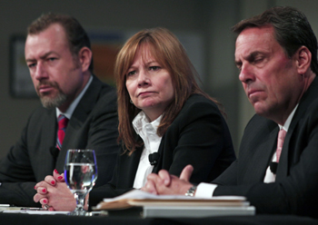 通用汽車首席執(zhí)行官芭拉(中)在公布關(guān)于因點火開關(guān)故障召回事件調(diào)查報告的發(fā)布會上。 資料照片 |