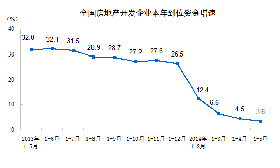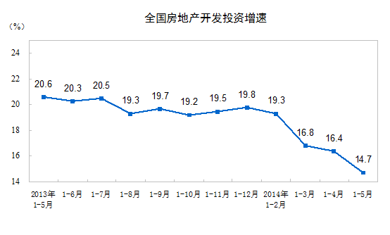 2014年1-5月份,全國房地產(chǎn)開發(fā)投資30739億元,同比名義增長14.7%,增速比1-4月份回落1.7個百分點。其中,住宅投資21043億元,增長14.6%,增速回落2個百分點,占房地產(chǎn)開發(fā)投資的比重為68.5%。