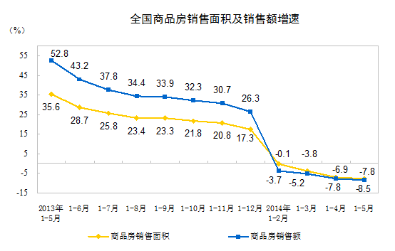 1-5月份,商品房銷售面積36070萬平方米,同比下降7.8%,降幅比1-4月份擴(kuò)大0.9個百分點。其中,住宅銷售面積下降9.2%,辦公樓銷售面積下降5.8%,商業(yè)營業(yè)用房銷售面積增長0.6%。商品房銷售額23674億元,下降8.5%,降幅比1-4月份擴(kuò)大0.7個百分點。其中,住宅銷售額下降10.2%,辦公樓銷售額下降14.0%,商業(yè)營業(yè)用房銷售額增長2.5%。