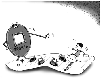 在北京,隆安律師事務(wù)所合伙人金作鵬稱(chēng),他所代理的數(shù)十起信托訴訟涉及多類(lèi)“免責(zé)陷阱”:一是信息披露不到位,信托公司在網(wǎng)站發(fā)布凈值,代替實(shí)地寄送;二是利用復(fù)雜法律文書(shū)脫責(zé),設(shè)法提高投資者問(wèn)責(zé)、中止已虧損信托的條件;三是用產(chǎn)品說(shuō)明書(shū)等取代合同協(xié)議!耙恍┳龇ㄒ茁裣码[患,甚至只給投資者合同封底,簽字后再寄送全文!